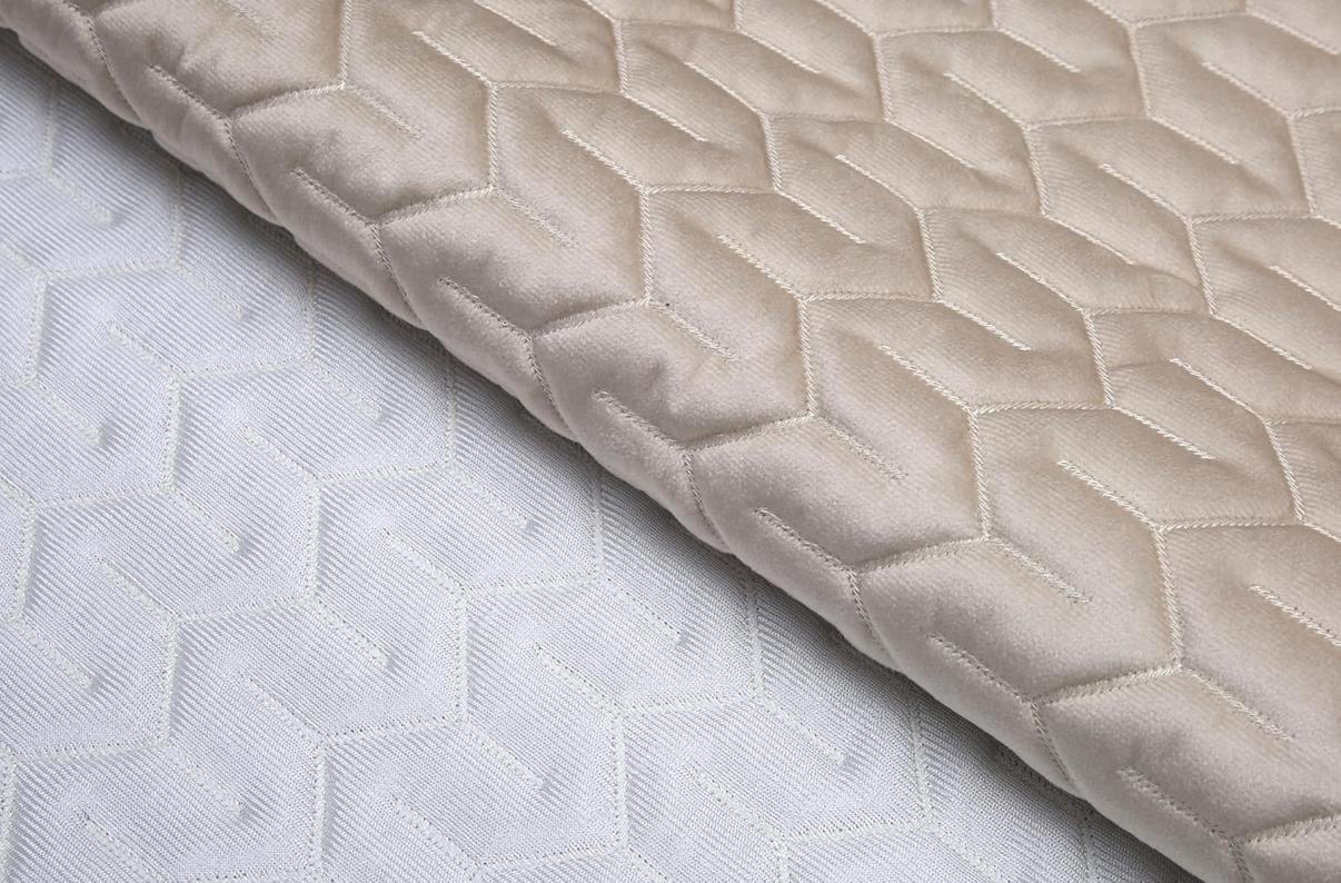 This quilted furniture cover or protector is presented in a soft, champagne color. The texture is created by a complex geometric quilting interlocking hexagon design stitched across a plush, possibly velvet or micro-suede, fabric. The cover is finished with a neat matching fabric border, offering a clean, contemporary look that is both cozy and refined.