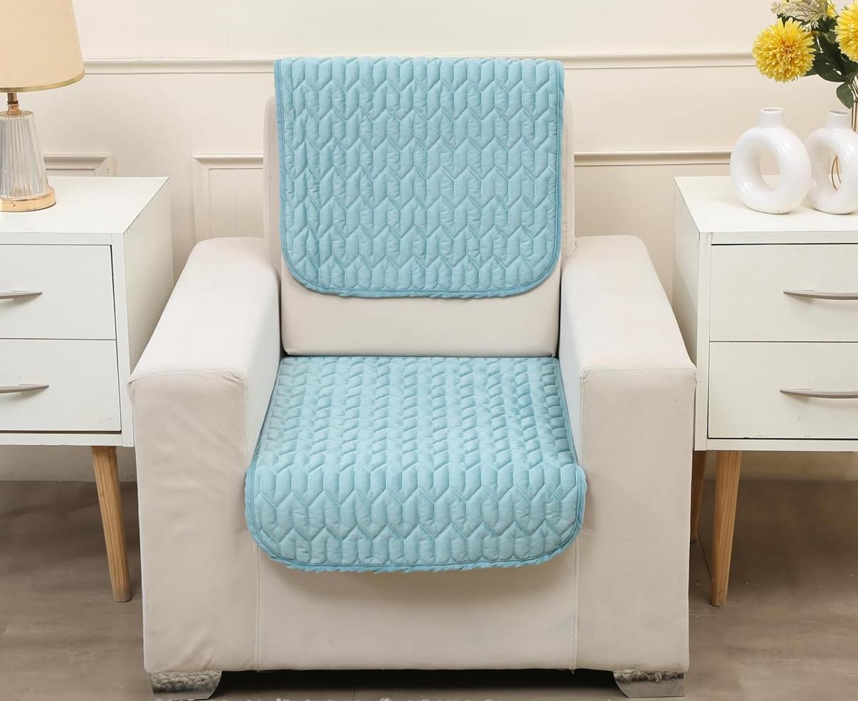 This is a plush, quilted seat and back protector (not a full cover) in a bright aqua or teal blue. The soft fabric features a dense, repeating geometric or chevron quilting pattern with bound edges, providing cushion protection and a pop of color.