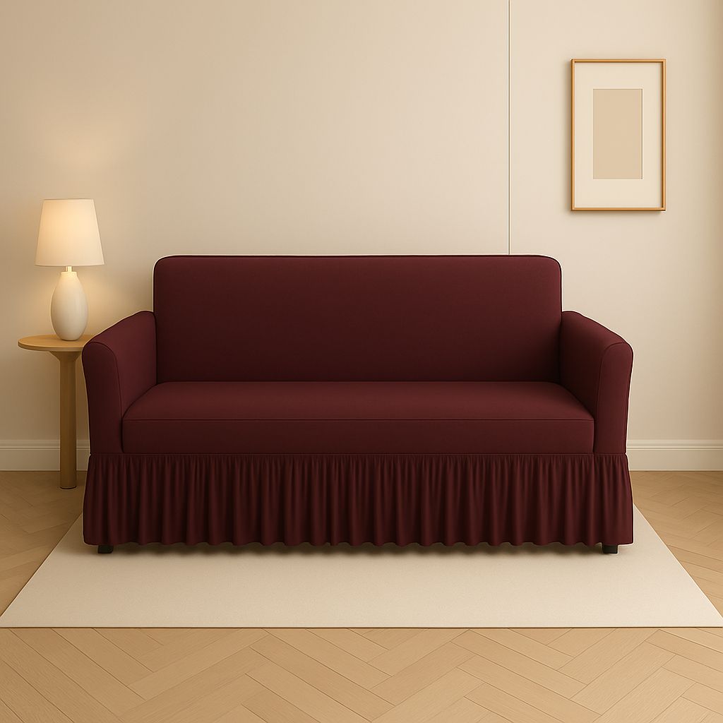 This cover makes a strong, classic statement in a solid, saturated deep red or burgundy color. The tailored body provides a clean fit, beautifully complemented by the traditional, floor-length ruffled skirt at the base, resulting in a rich, cozy, and formal feel.