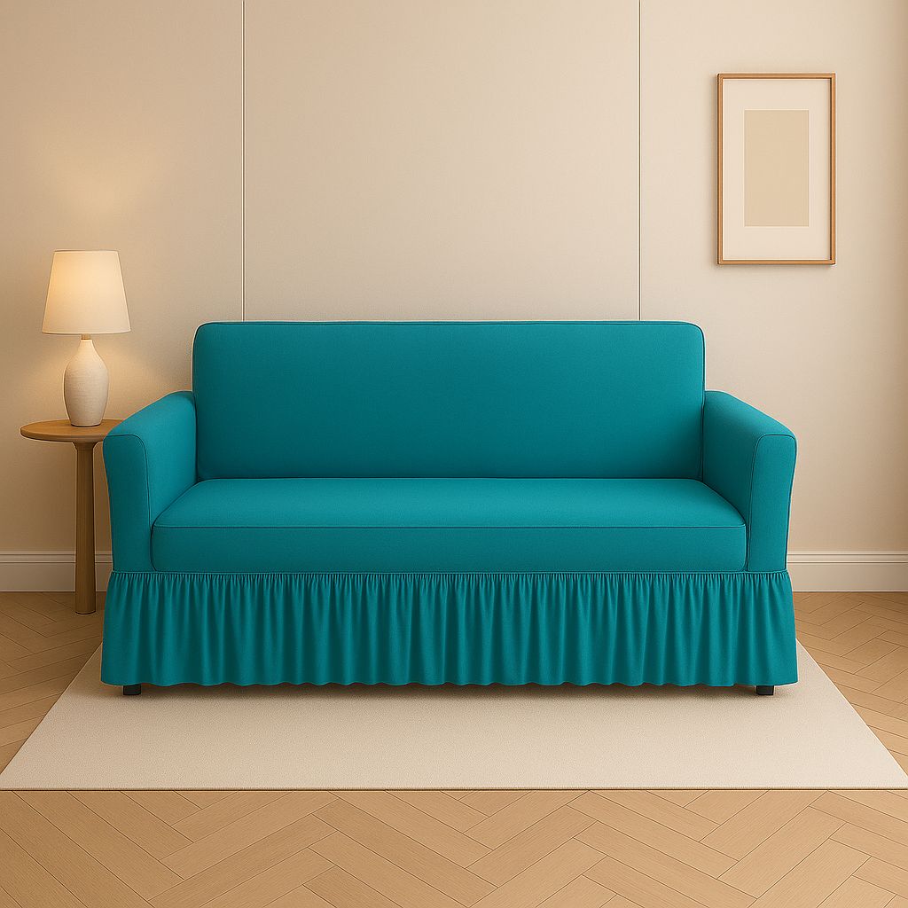 This vibrant teal sofa cover instantly infuses energy and color into your space. Its design features a smooth, uniform texture on the main body with a contrasting pleated ruffle along the base. The aesthetic is refreshing, playful, and contemporary, lending itself well to eclectic, coastal, or mid-century inspired interiors that need a color pop.
