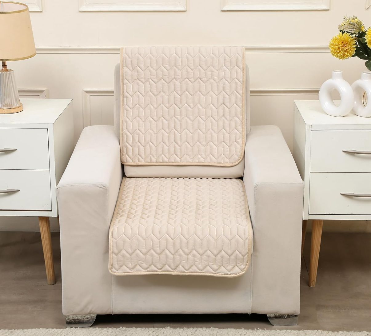 This set uses cream or ivory quilted seat protectors on white chairs. The protectors feature a subtle wave or honeycomb pattern, providing a comfortable layer of padding and protection against spills and wear on high-traffic areas, while maintaining a clean, monochromatic look.