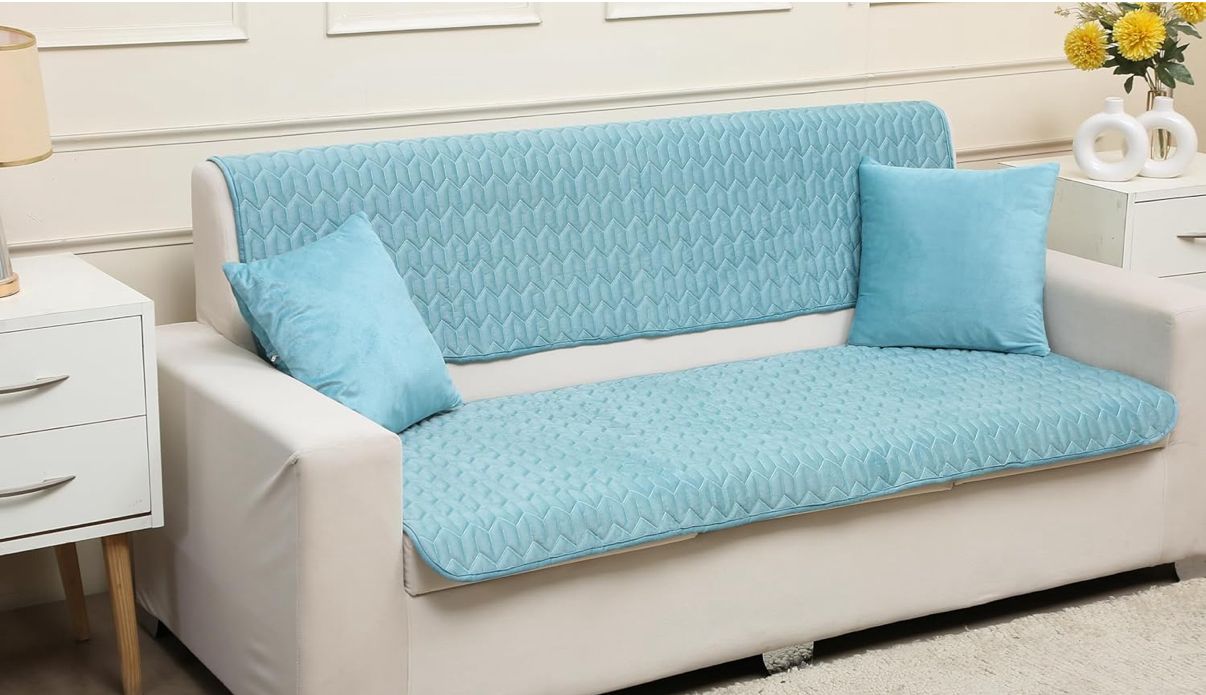 This is a plush, quilted seat and back protector (not a full cover) in a bright aqua or teal blue. The soft fabric features a dense, repeating geometric or chevron quilting pattern with bound edges, providing cushion protection and a pop of color.