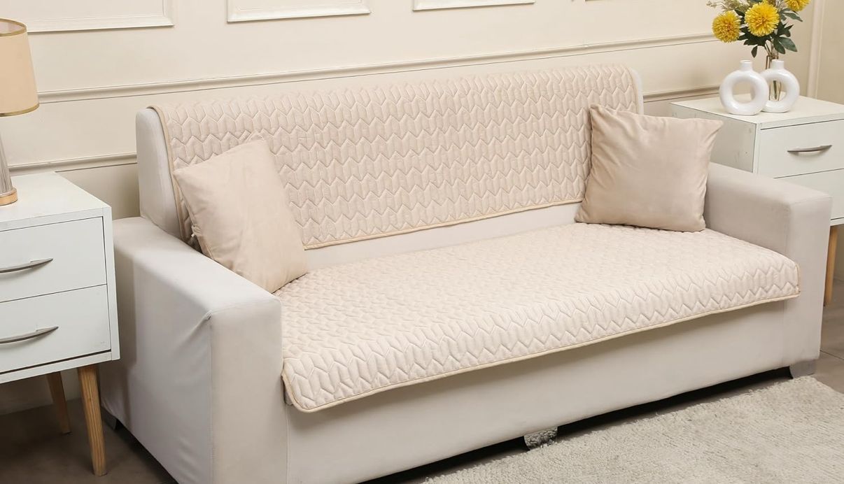 This set uses cream or ivory quilted seat protectors on white chairs. The protectors feature a subtle wave or honeycomb pattern, providing a comfortable layer of padding and protection against spills and wear on high-traffic areas, while maintaining a clean, monochromatic look.
