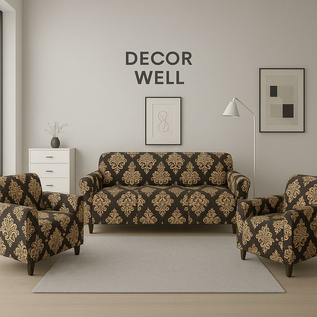 A richly patterned set in a classic style, featuring repeating ornate gold damask motifs against a deep espresso brown background. This luxurious, traditional design adds a touch of baroque opulence and formality, perfect for a grand or traditional setting.