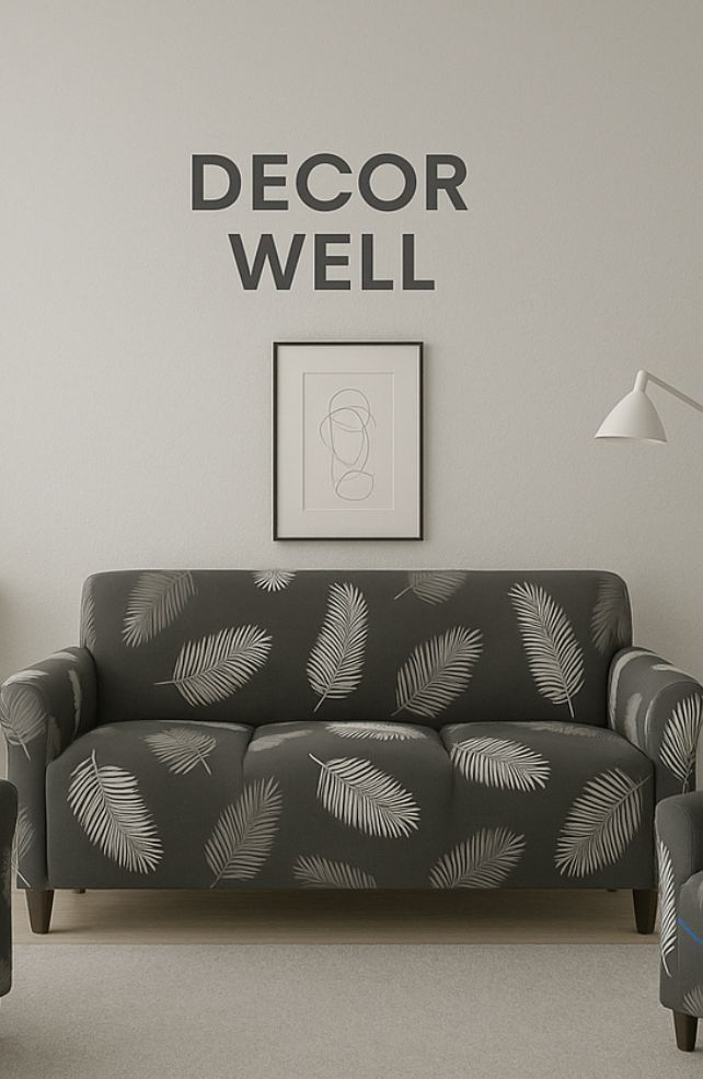 A sleek, tailored cover in a deep charcoal grey. It features a contemporary, scattered pattern of large metallic silver or light grey palm/fern leaves. This sophisticated design provides a modern, tropical, or art-deco accent.