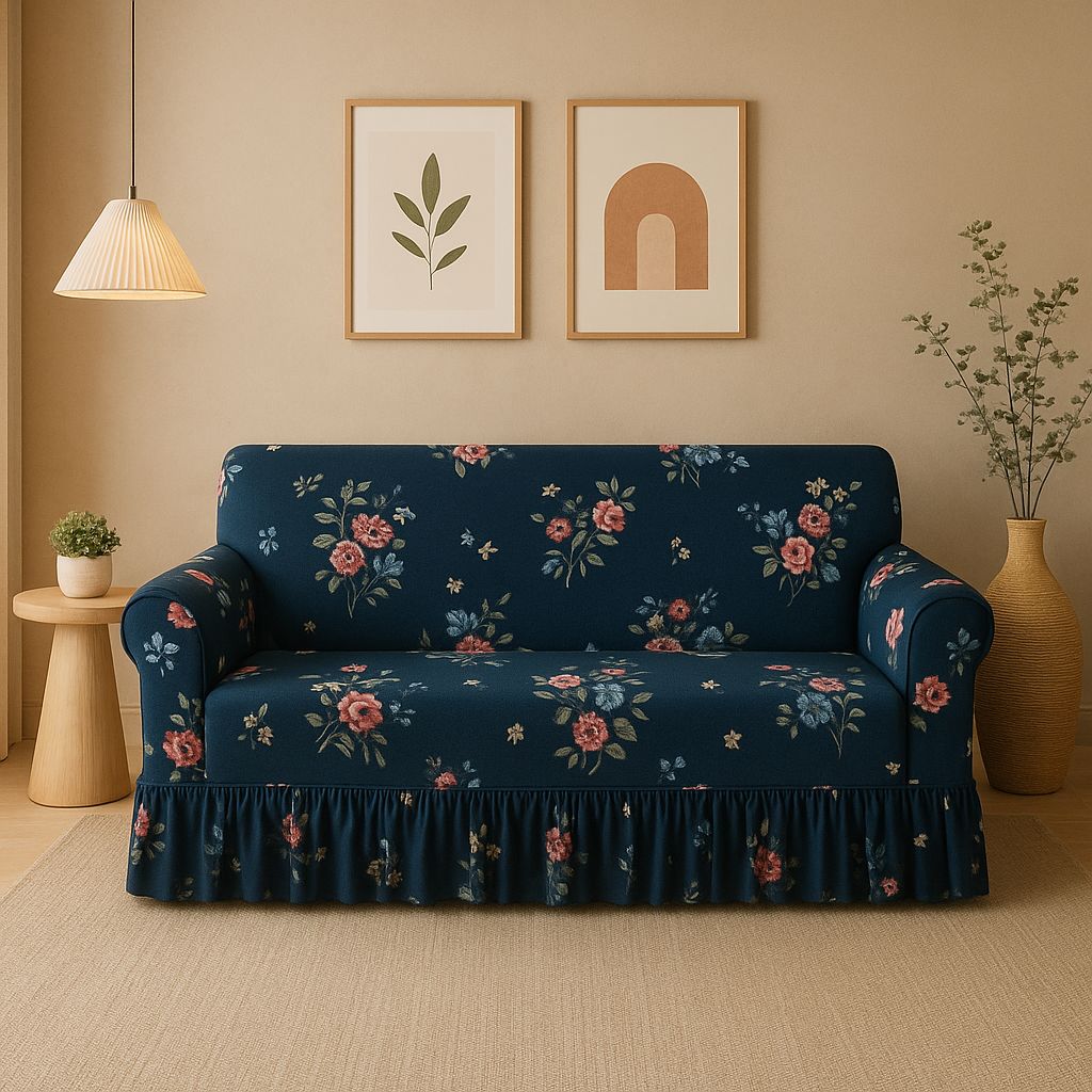 This sofa cover shares the deep navy base with a dense, colorful floral print of pink, red, and blue flowers. The design is vibrant and classic. A prominent ruffle skirt at the bottom adds a traditional, charming finish. The aesthetic is cozy, feminine, and cottage-chic, perfect for adding a burst of color and a soft, welcoming feel to a room.