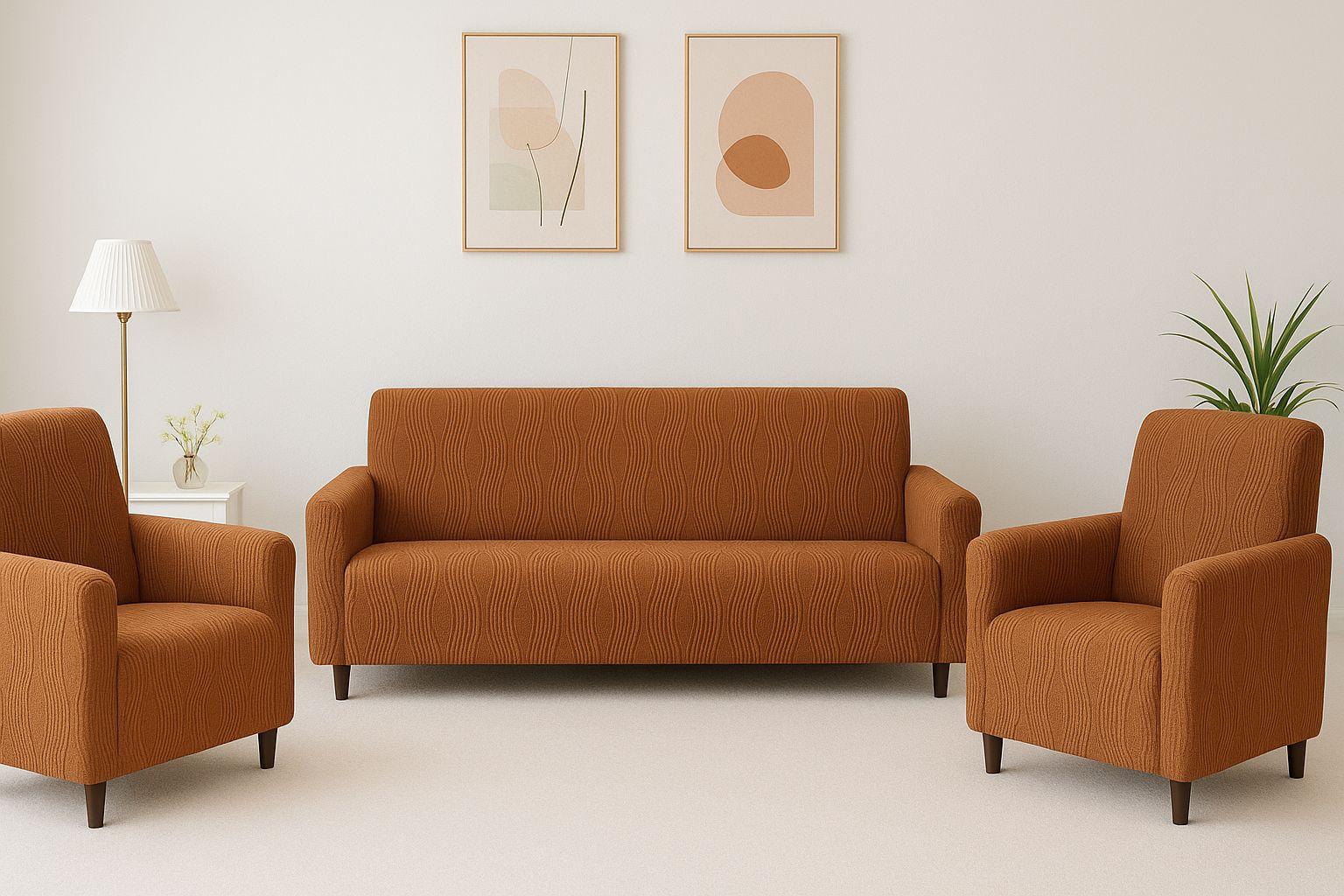 This cover set for a sofa and two armchairs comes in a rich, warm burnt orange. The material features an all-over subtle, embossed wavy or zig-zag texture that adds dimension and visual interest. The stretch fabric offers a snug, tailored fit that emphasizes the furniture's clean lines, creating a cozy and modern aesthetic with a warm, energetic accent.