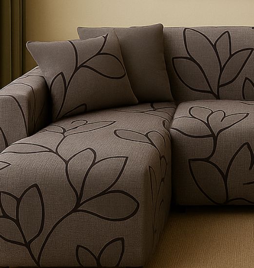 This sofa cover features a warm, muted taupe or grayish-brown base with a striking oversized botanical pattern in a darker, contrasting shade of brown. The leaf and stem motifs are bold yet simple, giving the cover a contemporary and slightly mid-century modern aesthetic. The snug fit provides a clean, tailored look, ideal for adding a touch of organic elegance and sophistication to a space, especially against rich wall colors like the deep green shown.