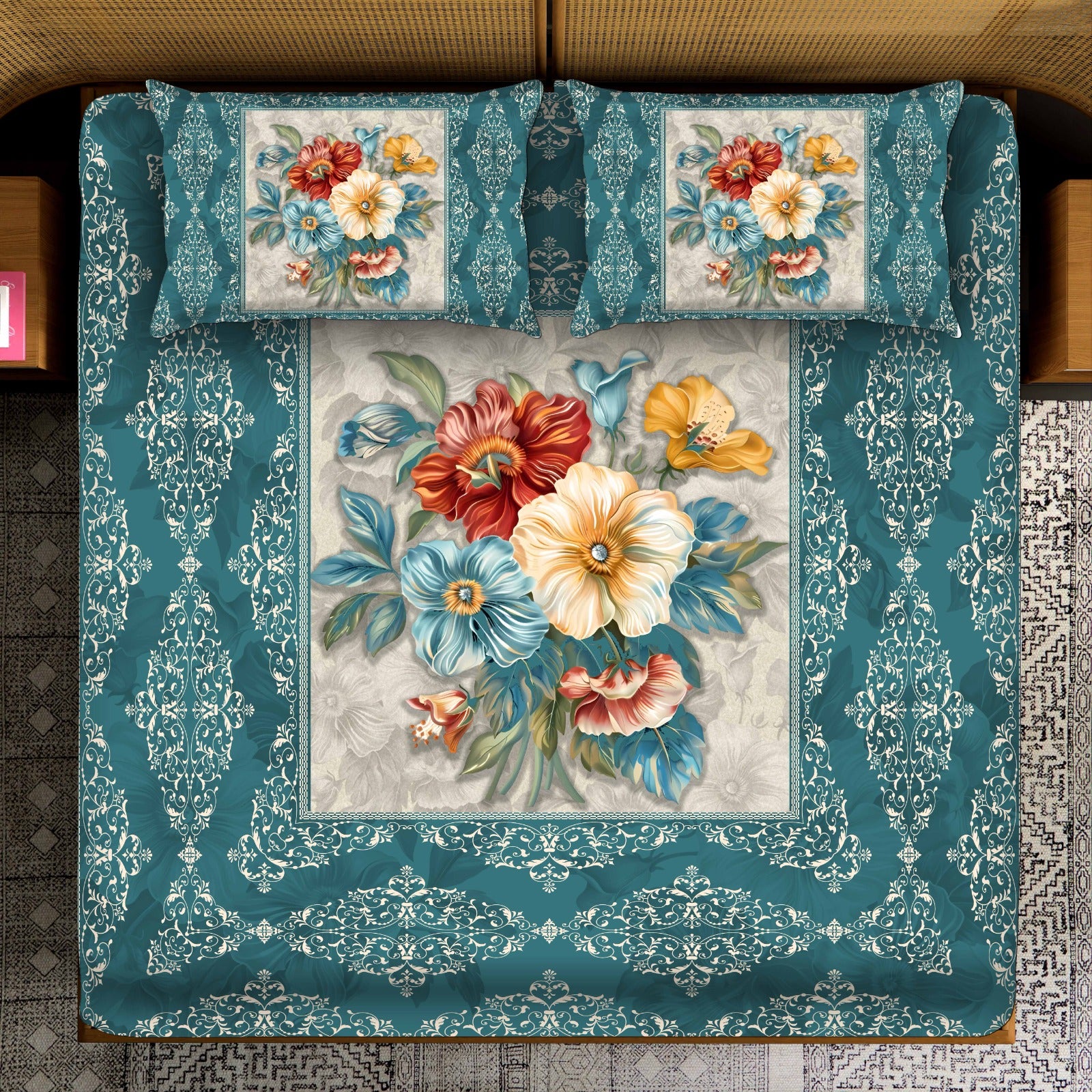 This luxurious bedsheet showcases a grand, centrally placed bouquet of vibrant, detailed flowers in rich red, sunny yellow, and striking blue. This central panel is framed by an elaborate border of intricate white damask and scrollwork set against a bold deep teal or turquoise background, creating an elegant, jewel-toned, and regal look.