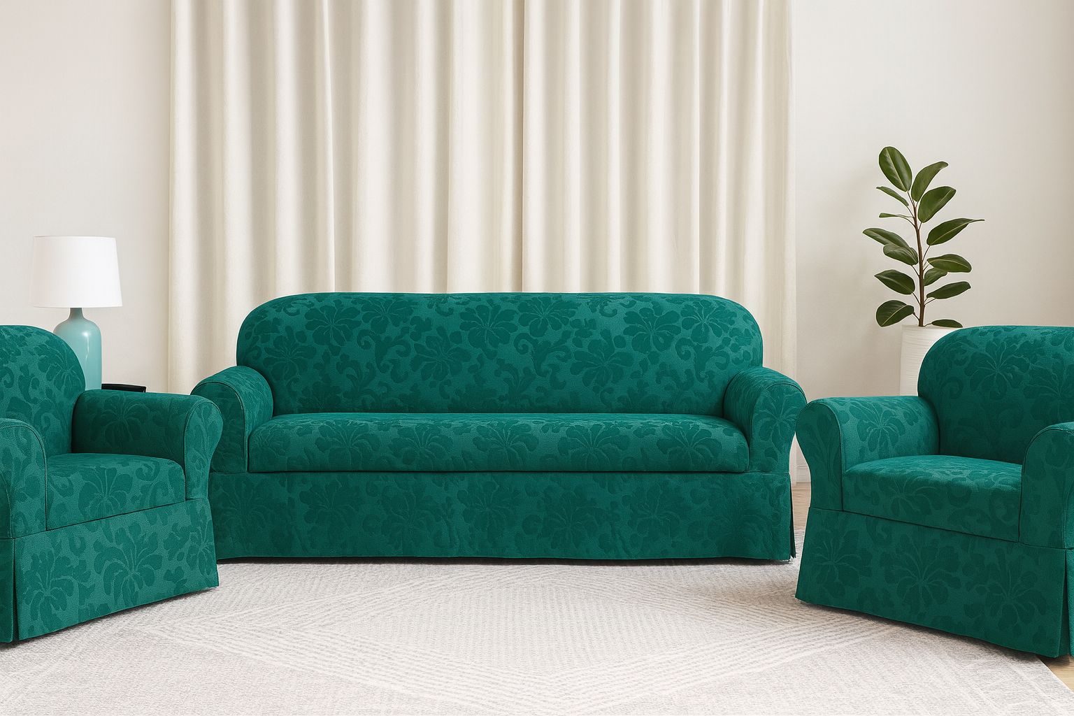 A bold and vibrant set in a beautiful deep teal shade. The fabric features an all-over jacquard floral or damask pattern woven into the material. The tone-on-tone design is highly textural and brings a dramatic, luxurious, and slightly retro flair to any living room setting.