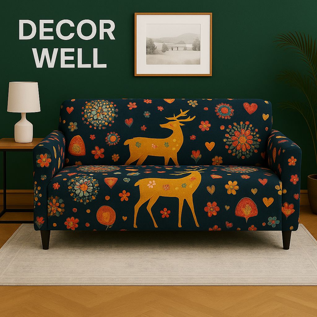 This unique cover showcases a folk-art-inspired print on a dark navy base. The design features stylized, golden deer surrounded by vibrant, abstract florals, hearts, and mandalas in warm tones like orange, red, and yellow. The aesthetic is whimsical, bohemian, and highly decorative, perfect for a maximalist or eclectic room looking for a conversation-starting piece with a fun, free-spirited vibe.