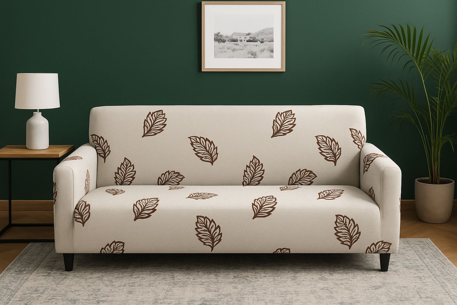 A light, earthy beige cover for a sectional, featuring scattered, stylized brown leaf silhouettes. The organic pattern creates a serene, biophilic aesthetic that is both contemporary and calming. Its neutral palette easily complements a variety of modern and natural decor styles.
