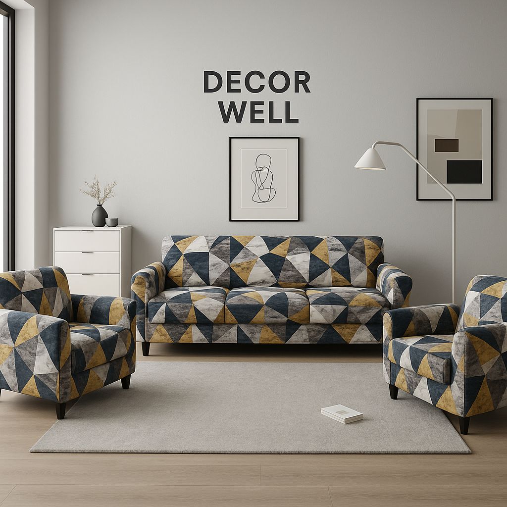 Featuring a dynamic, abstract triangular mosaic, this cover combines navy blue, mustard yellow, and marbled grey for an energetic, mid-century modern look. The sharp geometric lines and contrasting colors provide a stylish focal point, adding a pop of art-deco inspired flair to the seating.