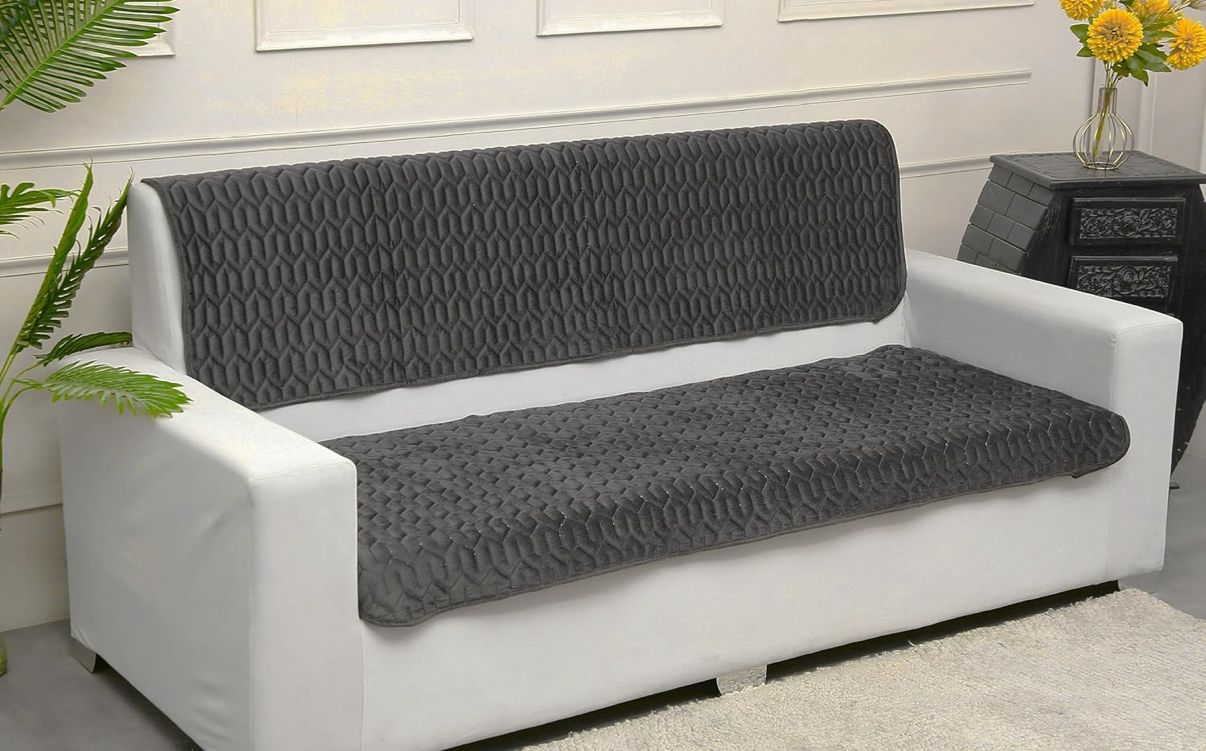 This is a plush, quilted seat and back protector (not a full cover) in a serenic grey. The soft fabric features a dense, repeating geometric or chevron quilting pattern with bound edges, providing cushion protection and a pop of color.