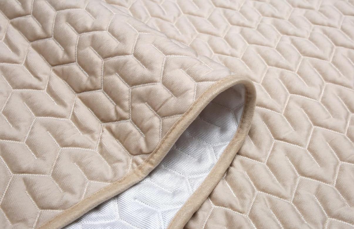 This quilted furniture cover or protector is presented in a soft, warm beige color. The texture is created by a complex geometric quilting interlocking hexagon design stitched across a plush, possibly velvet or micro-suede, fabric. The cover is finished with a neat matching fabric border, offering a clean, contemporary look that is both cozy and refined.