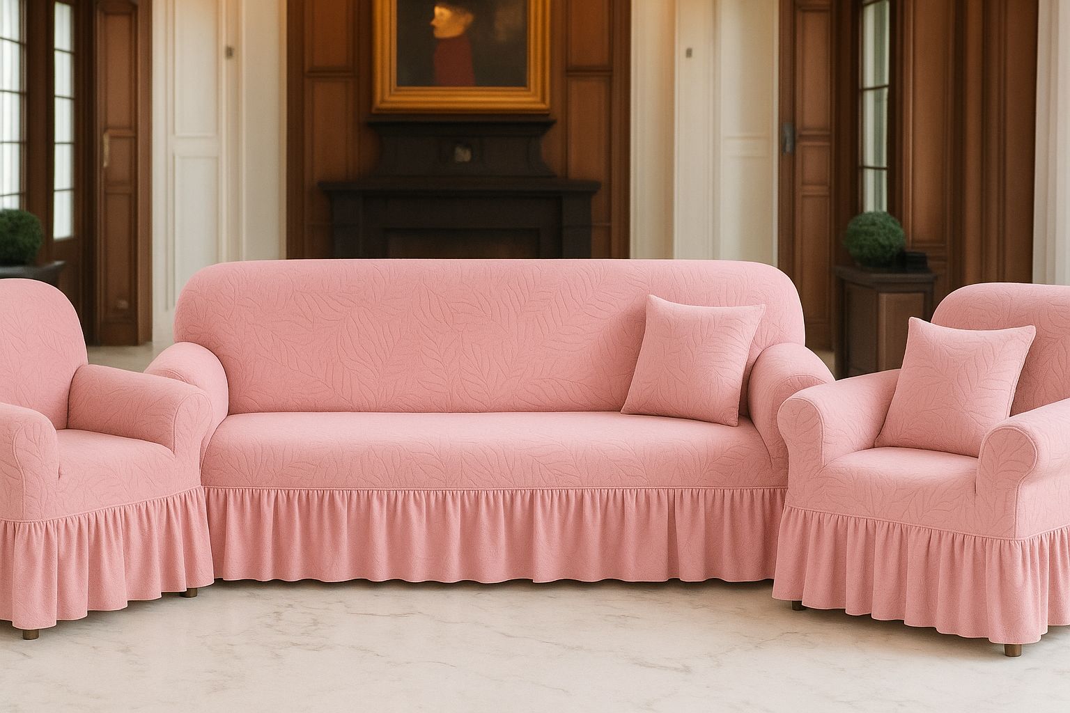 A delicate and charming cover set in a soft pale pink or dusty rose. The main fabric has a subtle tone-on-tone leaf texture. The look is completed with a full, gathered ruffle skirt on both the sofa and armchairs, perfect for a romantic or feminine decor.
