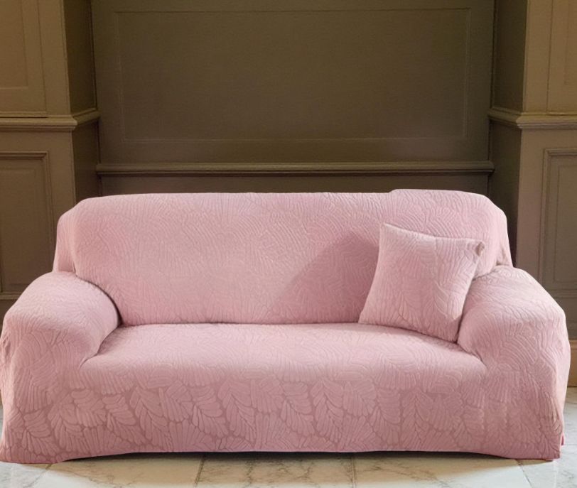 A fitted stretch cover in a soft, solid pale pink or blush color. The material features a fine, all-over embossed leaf or vine pattern for textural interest. This creates a gentle, feminine, and slightly whimsical style.