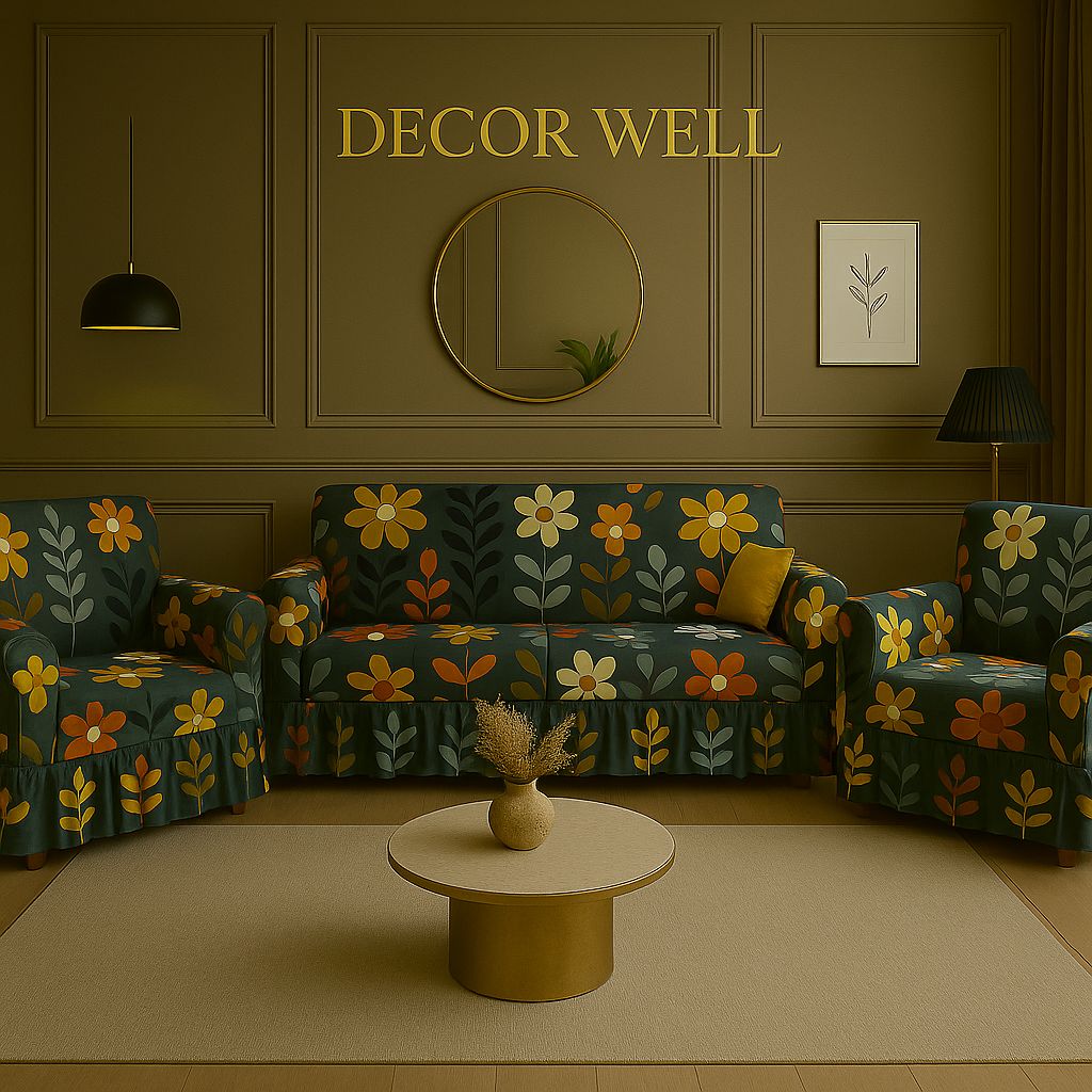 This playful set includes a sofa and two armchairs, all featuring a dark olive-green base with large, stylized flowers and leaves in vibrant retro colors like yellow, orange, and white. A gathered ruffle skirt adds a feminine, cottage-chic touch. The aesthetic is mid-century modern, whimsical, and cheerful, perfect for an eclectic or vintage-inspired room needing a bright, unifying pattern.