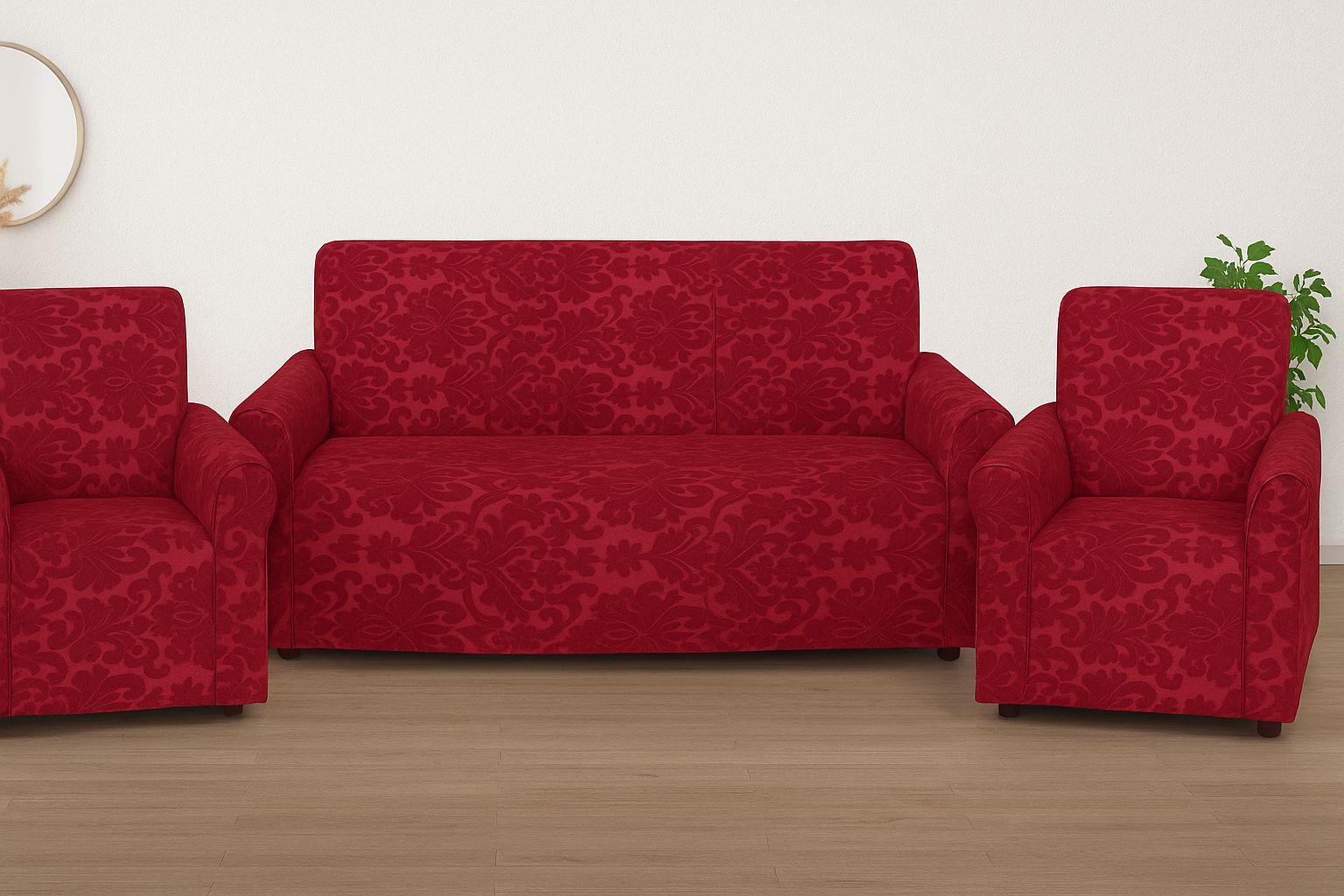 This bold set is featured in a vivid, rich true red color. The entire surface is covered in a highly textural, tone-on-tone damask or large floral pattern. The striking color and classic woven pattern create an aesthetic that is dramatic, traditional, and opulent.