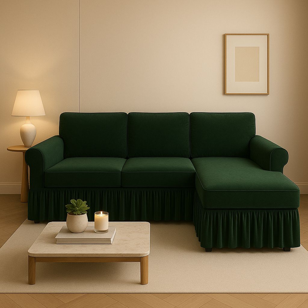 A luxurious cover for a sectional sofa in a deep, vibrant evergreen or forest green color. The body is sleek and tailored, contrasting beautifully with the voluminous ruffle skirt along the base. The result is a bold, refined look with a touch of traditional charm.