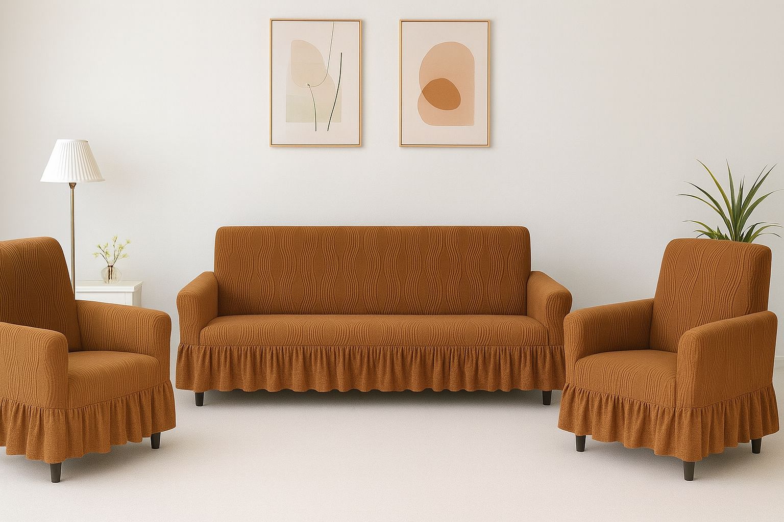 This striking rust-orange cover set for a sofa and two chairs features a rich, subtle wavy texture throughout, offering visual interest. The look is grounded by a traditional ruffled skirt along the base, giving a warm, vintage, or farmhouse feel. The vibrant color adds an energetic and cozy accent to the room.